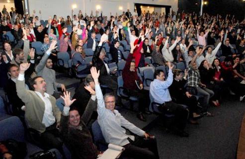 Em assembleia estadual, na noite de quarta-feira 10 de julho de 2013, em Porto Alegre, que lotou o teatro da Associação Médica