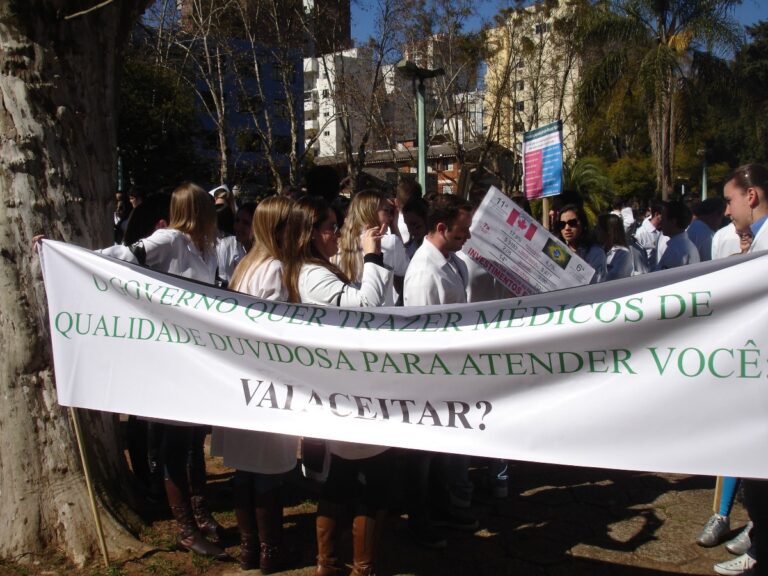 Nesta terça-feira, às 13 horas, diversos médicos e estudantes de medicina se reuniram junto a Praça Tamandaré, vestindo jaleco com laço preto. Na
