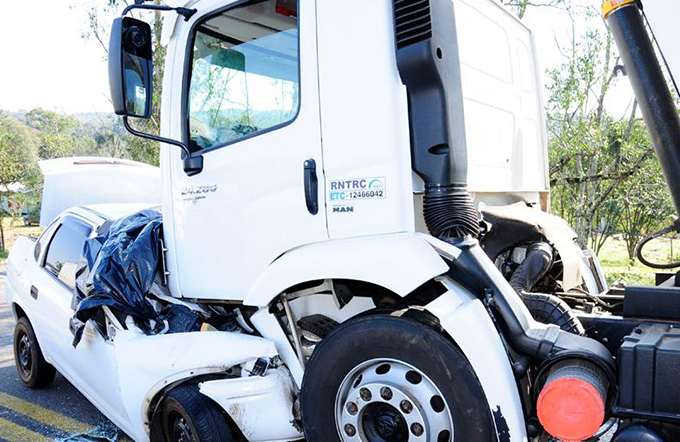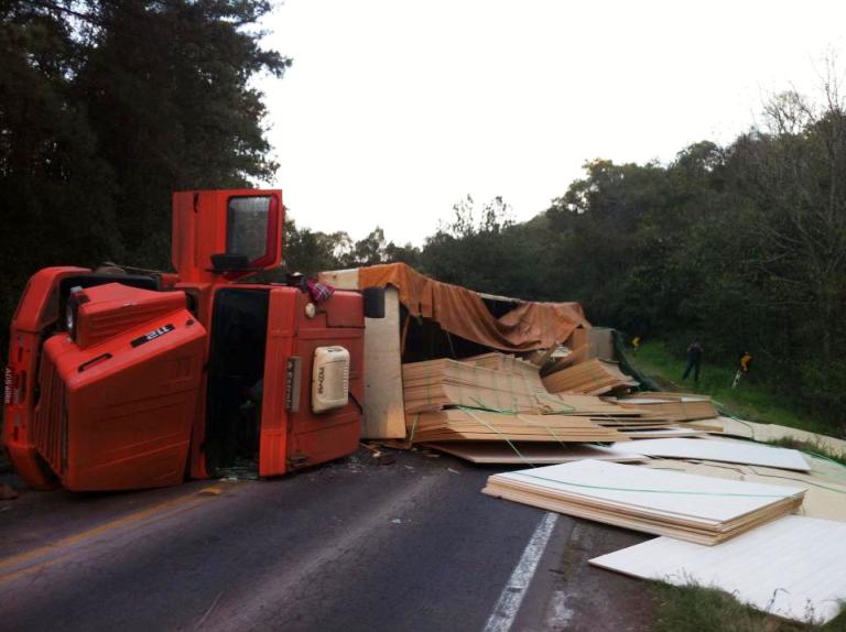 Um caminhão, com placas ADS 6055, de Foz do Iguaçu (PR) , tracionado, carregado com chapas de madeira transitava na estrada da morte