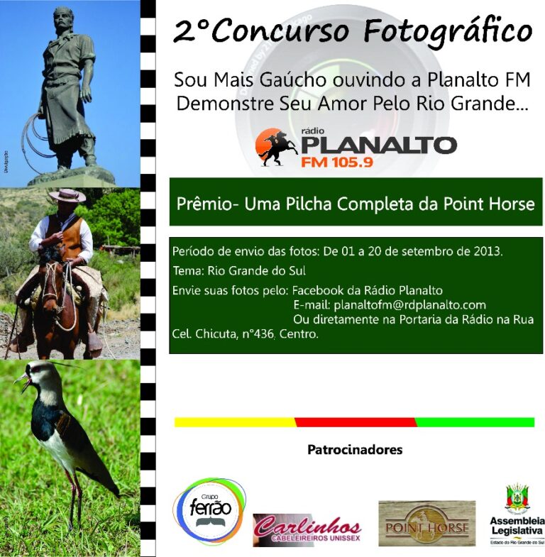Participe da promoção: sou mais gaúcho ouvindo a Planalto FM e concorra a uma pilcha completa da Point Horse. A Rádio Planalto