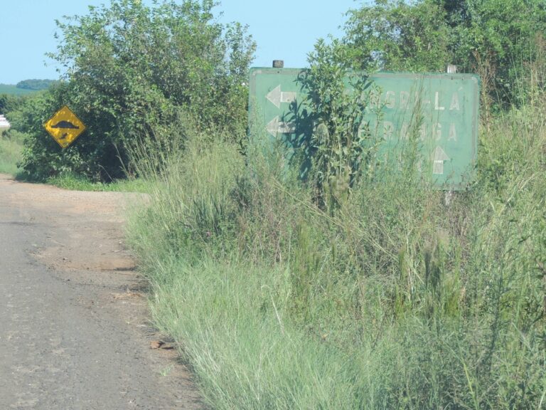 Algumas placas de sinalização de trânsito e de indicações de entrada de bairros na ERS-324, saída para Carazinho, estão encobertas pelo matagal.
