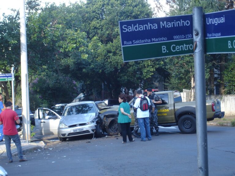 Acidente de trânsito deixa condutor ferido na Rua Uruguai esquina com a rua Saldanha Marinho, em Passo Fundo. Os veículos envolvidos foram