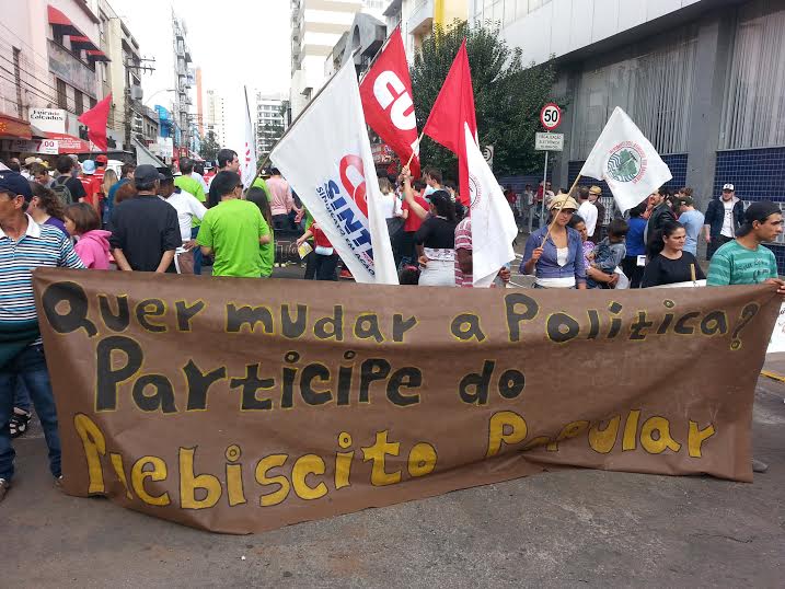 Integrantes de diversos movimentos sociais e sindicatos, de Passo Fundão e região, bloquearam a rua Bento Gonçalves, no Centro de Passo Fundo.