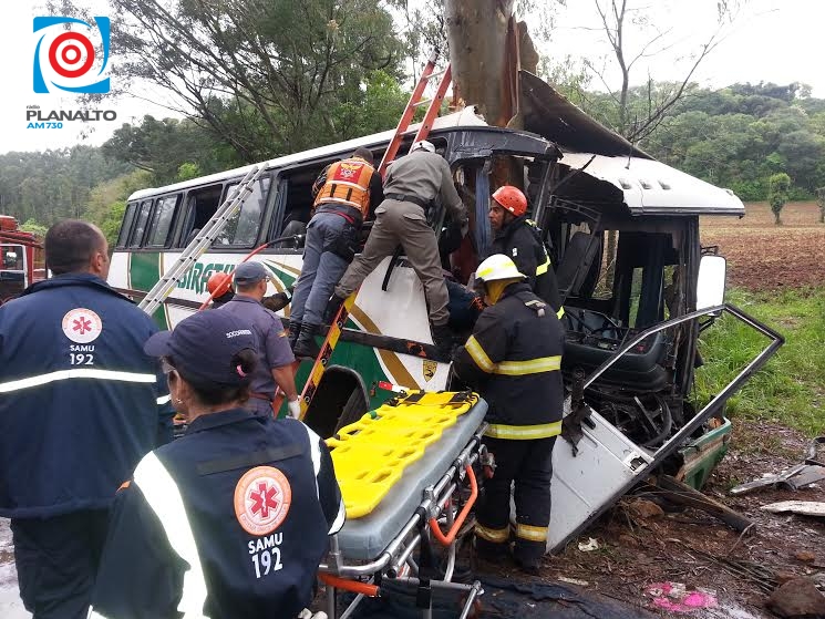 Duas pessoas ficaram presas às ferragens de um ônibus, que se chocou frontalmente contra um eucalipto no km 95 da ERS-324, na