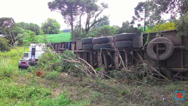 Um caminhão caçamba, com placas de Fagundes Varela – RS, carregado com retalhos de madeira tombou no km 97 da ERS-324, próximo