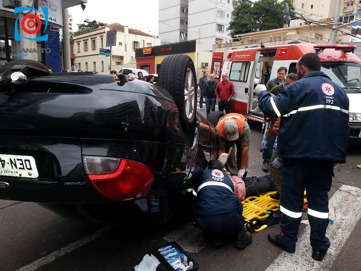 Um Ford/Mondeo de cor preta e placas DEN-4796, de Passo Fundo, capotou na esquina das ruas Paissandu e Benjamin Constant, bem em