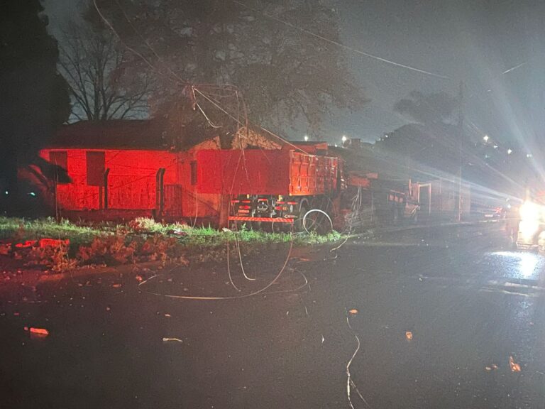 Na noite de segunda-feira (18), um caminhão desgovernado atingiu um poste de energia elétrica e colidiu contra duas residências no bairro Conceição,