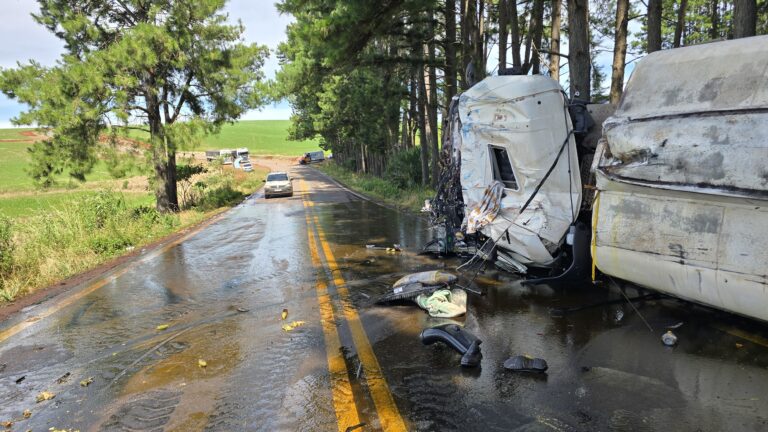 Na tarde desta terça-feira (16), o caminhão carregado com óleo vegetal que havia tombado nnaERS-463, no km 02, entre os municípios de