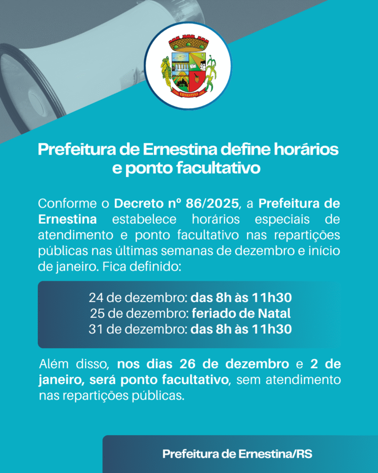 Conforme o Decreto nº 86/2025, a Prefeitura de Ernestina estabelece horários especiais de atendimento e ponto facultativo nas repartições públicas nas últimas