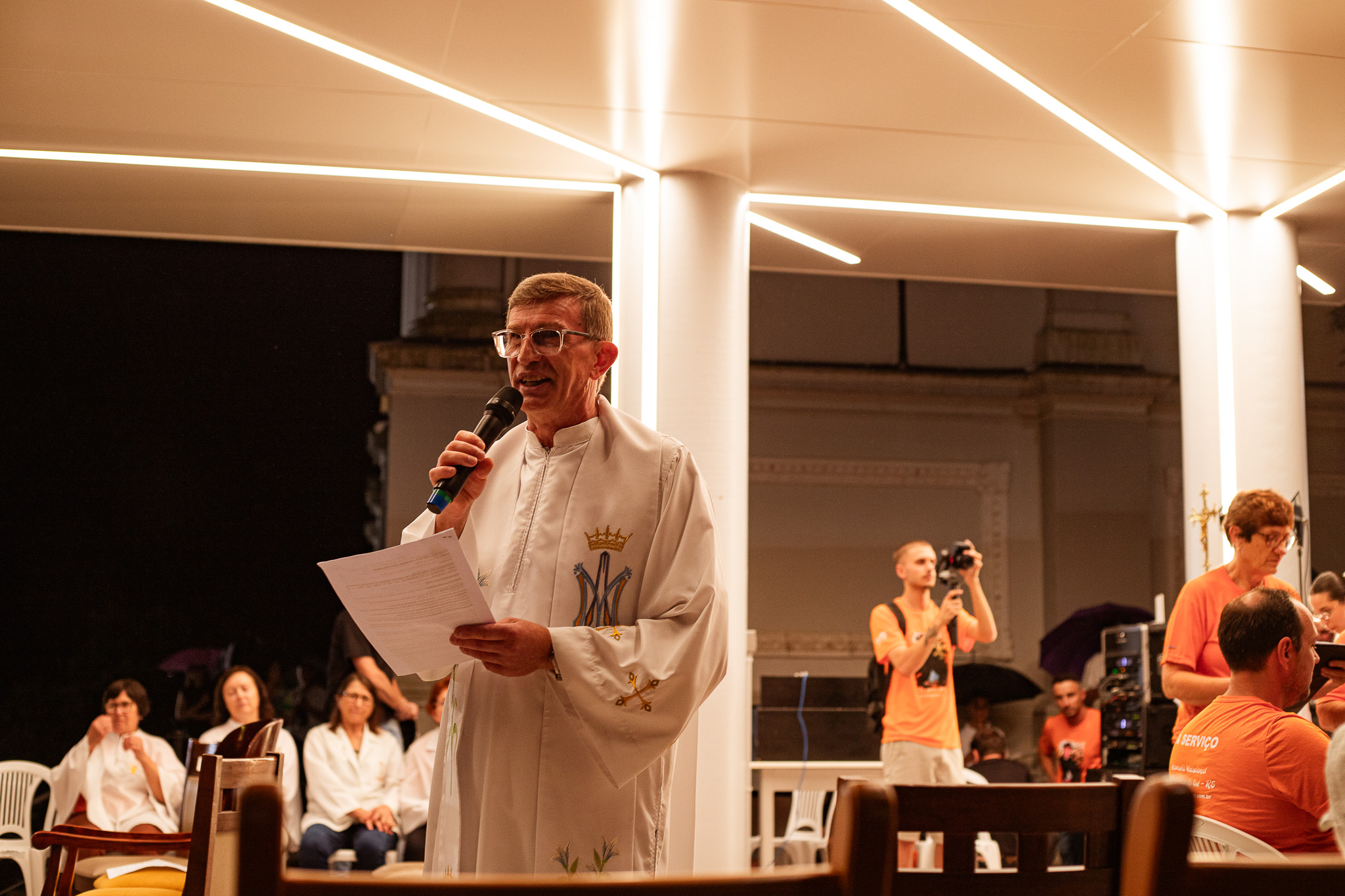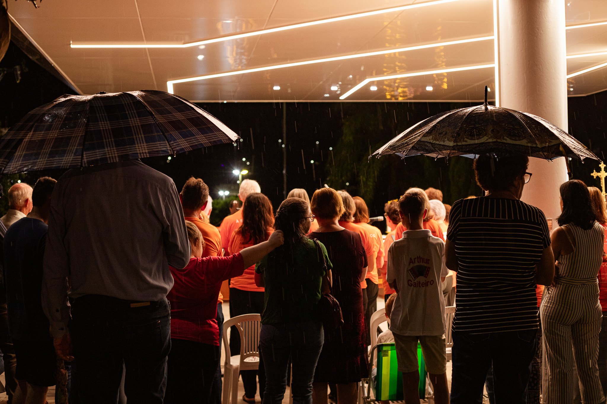 A primeira missa do Tríduo foi marcada por um sinal forte e bonito de fé na noite de quarta-feira, 31 de dezembro. Com o tema “A esperança que se renova na oração com o Pai”, a celebração presidida pelo padre Ari Antônio dos Reis aconteceu na área externa. A chuva marcou presença, mas as famílias estavam presentes em grande número.