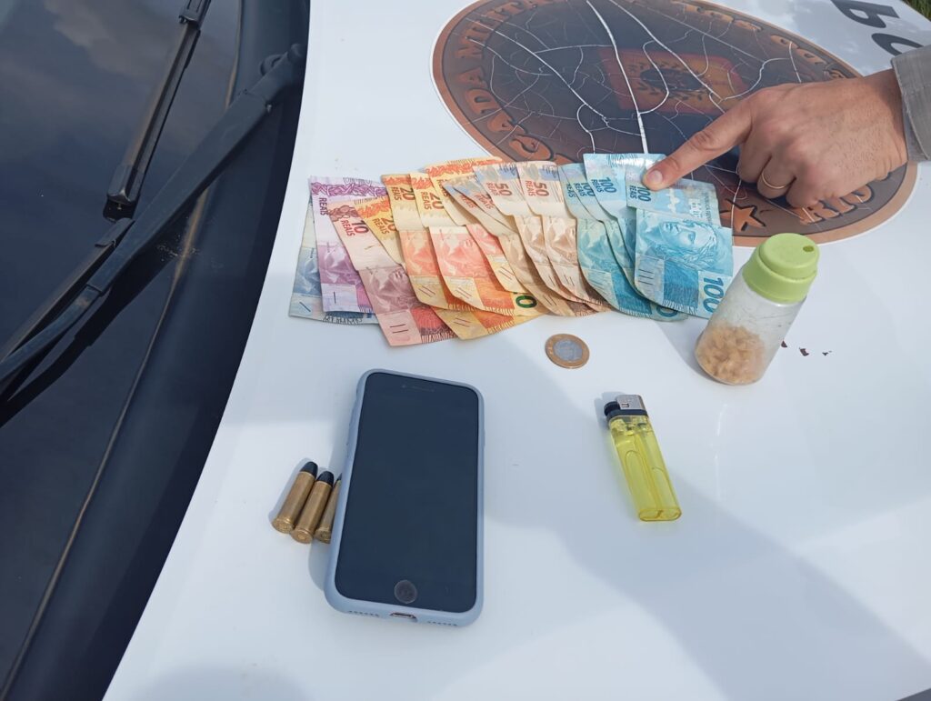 Durante a ação, o adolescente foi flagrado em posse de drogas e munição. Com o apoio da Polícia Civil, as equipes realizaram buscas nas imediações e localizaram um revólver calibre 38 municiado, que estava oculto em uma área de vegetação próxima ao local da abordagem.