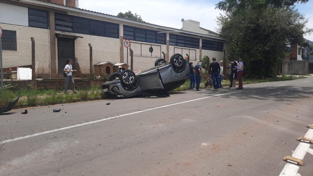 Na tarde de sábado (15), um acidente de trânsito com capotamento foi registrado na Vila Cruzeiro, no cruzamento das ruas Coronel Pelegrini e Parobé, em Passo Fundo. A colisão envolveu um Peugeot e um Renault Clio.