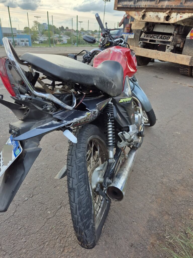 Um acidente de trânsito foi registrado na tarde deste sábado (11), na Rua dos Andradas, ao lado do Complexo Esportivo Delmar Sittoni, em Passo Fundo. A colisão envolveu um Ford Focus prata, um caminhão Volkswagen Constellation e uma motocicleta Honda CG 160.