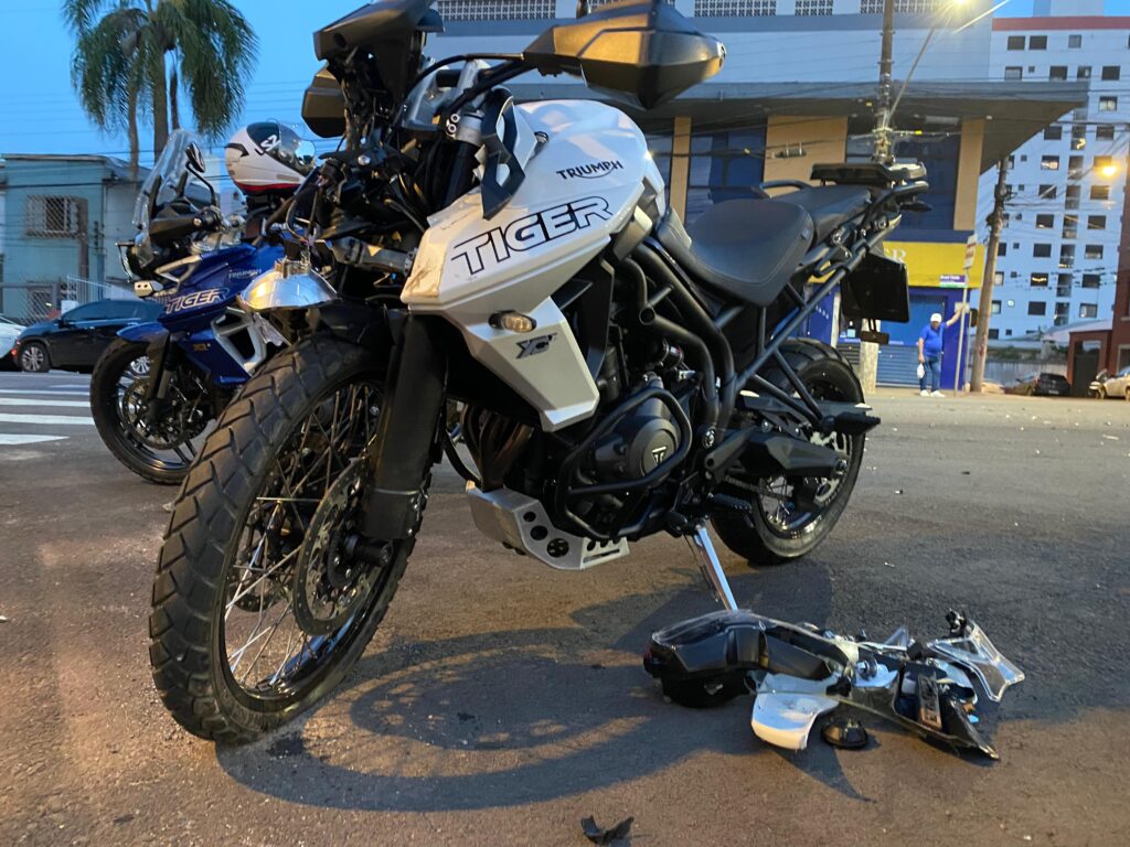 Um acidente de trânsito foi registrado no final da tarde deste domingo (05) no cruzamento da Avenida Brasil com a Rua 20 de Setembro, na região central da cidade. A colisão envolveu uma caminhonete Fiat Strada preta e uma motocicleta Tiger branca.