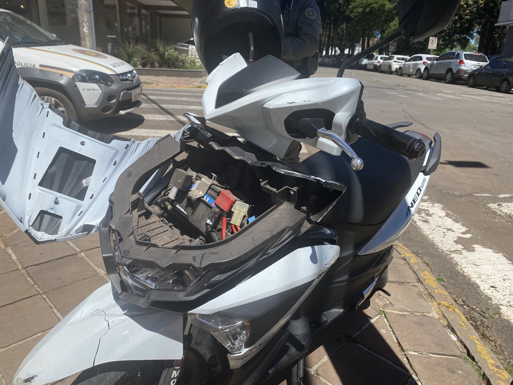 Na manhã desta sexta-feira (10), um acidente de trânsito foi registrado no cruzamento da Rua 15 de Novembro com a Rua Nascimento Vargas, em Passo Fundo. A colisão envolveu um Ford Ka branco e uma motocicleta Yamaha Biz branca.