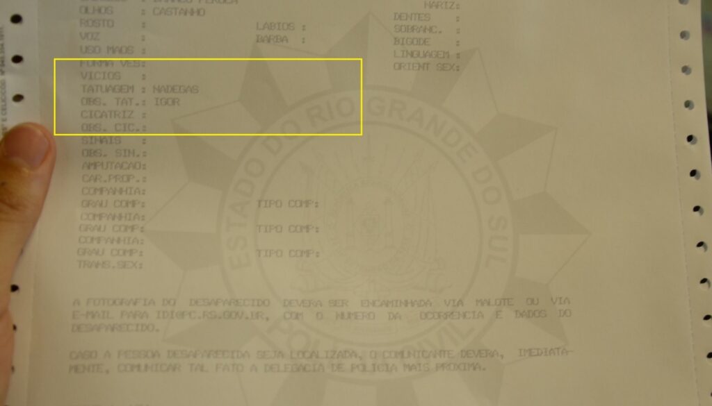 Segundo relato da mãe da adolescente, a fuga foi motivada por uma discussão com ela, pelo fato de a menor ter realizado uma tatuagem na nádega com o nome IGOR. A desaparecida, após discussão, se fechou no quarto e começou a se autoflagelar com uma tesoura nos braços, pernas e abdômen. Posteriormente, esfregou o sangue na parede e pulou a janela da casa