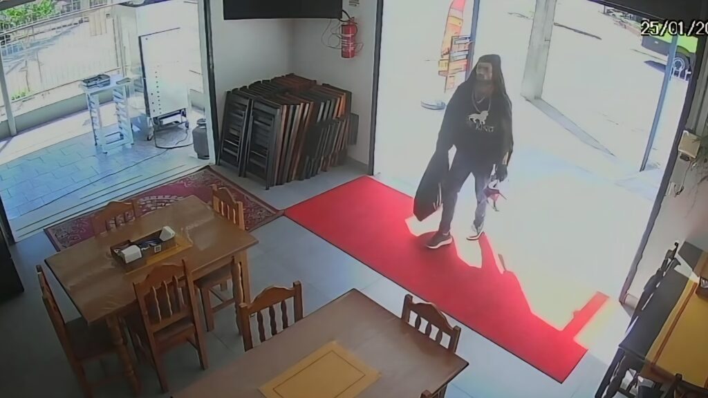Imagens de câmeras de segurança registraram o momento da ação criminosa e podem auxiliar na identificação do autor. Qualquer informação que possa contribuir com as buscas deve ser repassada à Brigada Militar pelo telefone 190.
