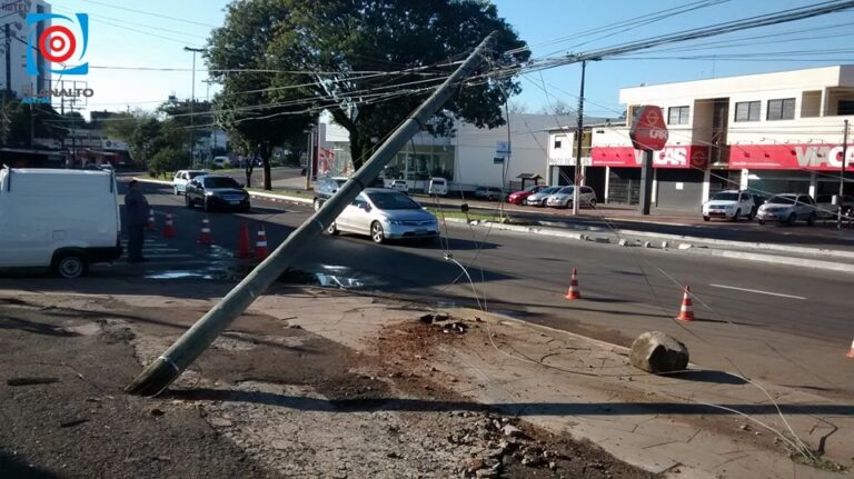 O motorista de um Ford/Focus de cor branca perdeu o controle do veículo e arrancou um poste de madeira na esquina da