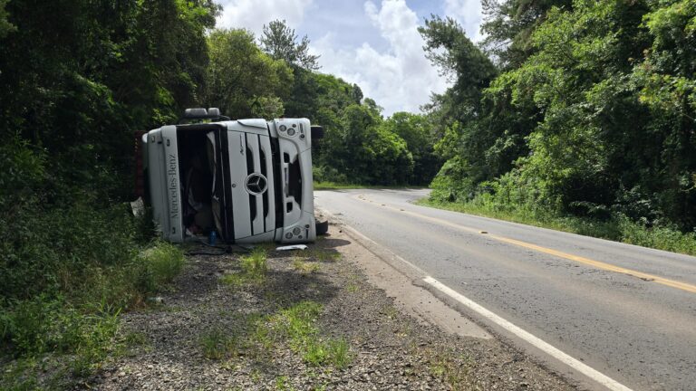 No início da tarde desta segunda-feira (17), um caminhão Mercedes-Benz Actros, com placas padrão Mercosul, tombou no km 202 da ERS-324, no