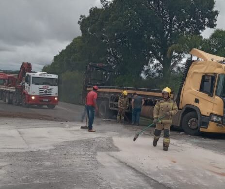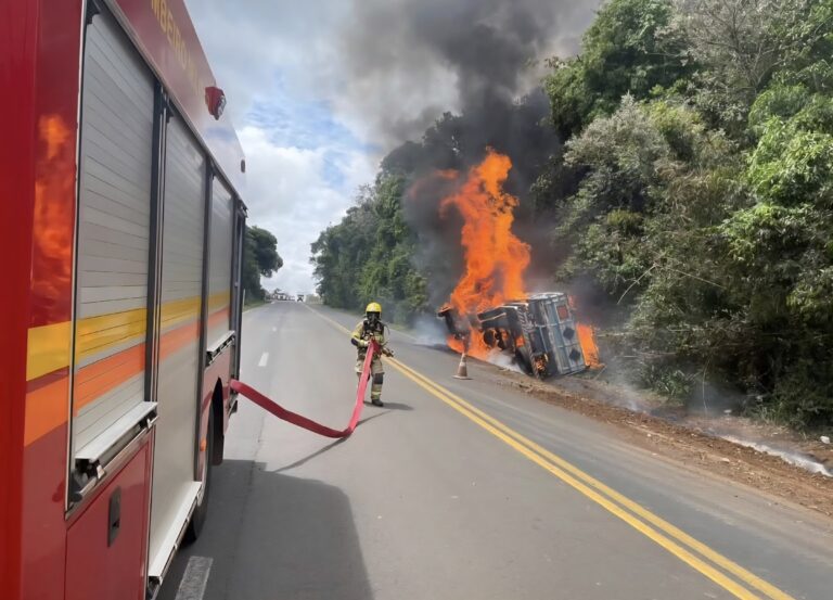 Na tarde de segunda-feira (17), um caminhão transportando carga considerada perigosa tombou e pegou fogo às margens da ERS-135, no km 73,