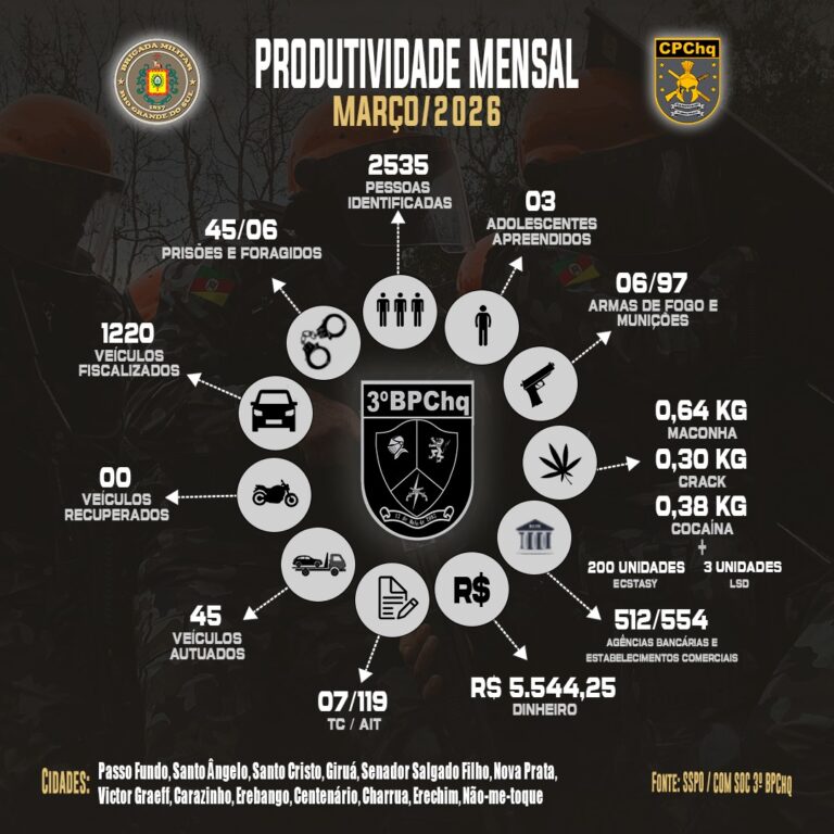 Na manhã desta quinta-feira (2), a Brigada Militar divulgou o balanço operacional do 3º Batalhão de Polícia de Choque referente ao mês