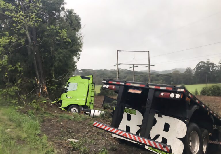 Uma carreta Volvo com placas padrão Mercosul saiu da pista e colidiu contra uma árvore na manhã desta quinta-feira (4), na ERS-324,