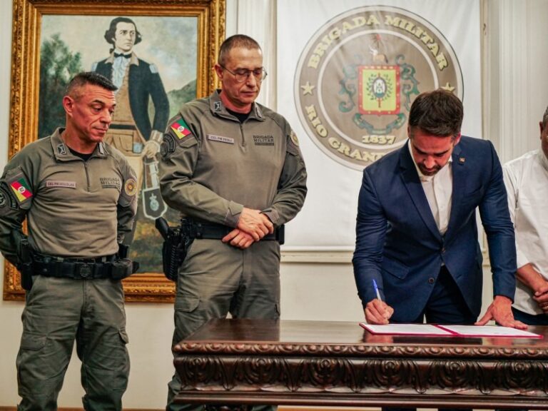 O governador do Rio Grande do Sul, Eduardo Leite, sancionou a nova Lei de Organização Básica (LOB) da Brigada Militar durante cerimônia
