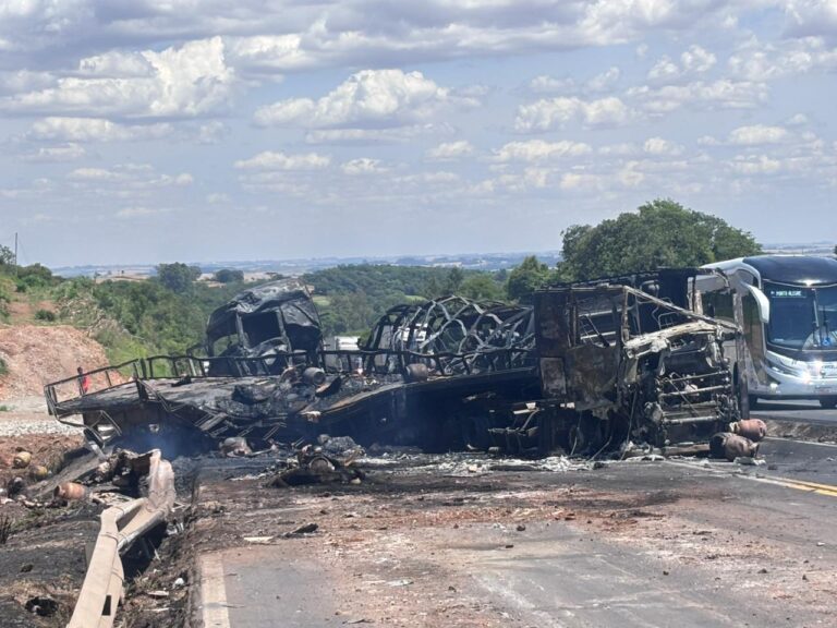 Acidente ocorreu na manhã desta quinta-feira (28); caminhão de gás colidiu com veículo que transportava papelão e ambos os motoristas conseguiram sair