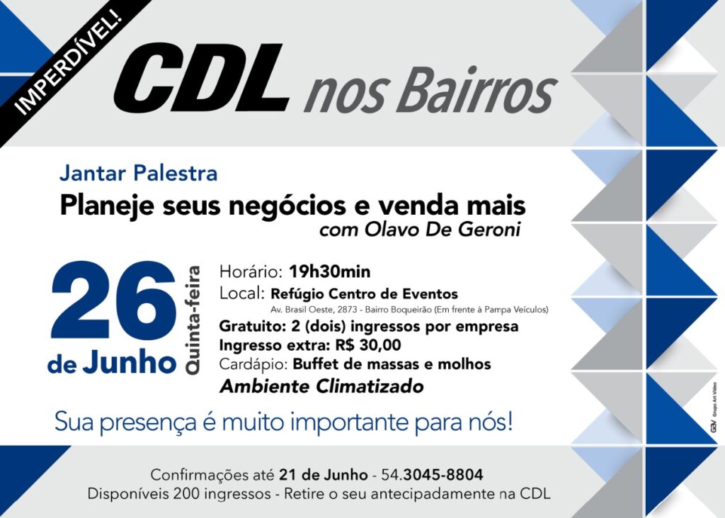 A CDL Passo Fundo realiza na próxima quinta-feira (26), mais um encontro da 5ª edição do CDL nos Bairros. O evento tem como objetivo fortalecer o vínculo entre o associado e a entidade, além de promover a integração entre os bairros participantes. A palestra “Planeje seus negócios e venda mais”, será ministrada pelo consultor empresarial Olavo De Geroni. O terceiro encontro deste ano acontece no Refúgio Centro de Eventos, na Av. Brasil Oeste, 2873, Bairro Boqueirão. A atividade inicia a partir das 19h30 e contará com um jantar de integração para os associados participantes.
