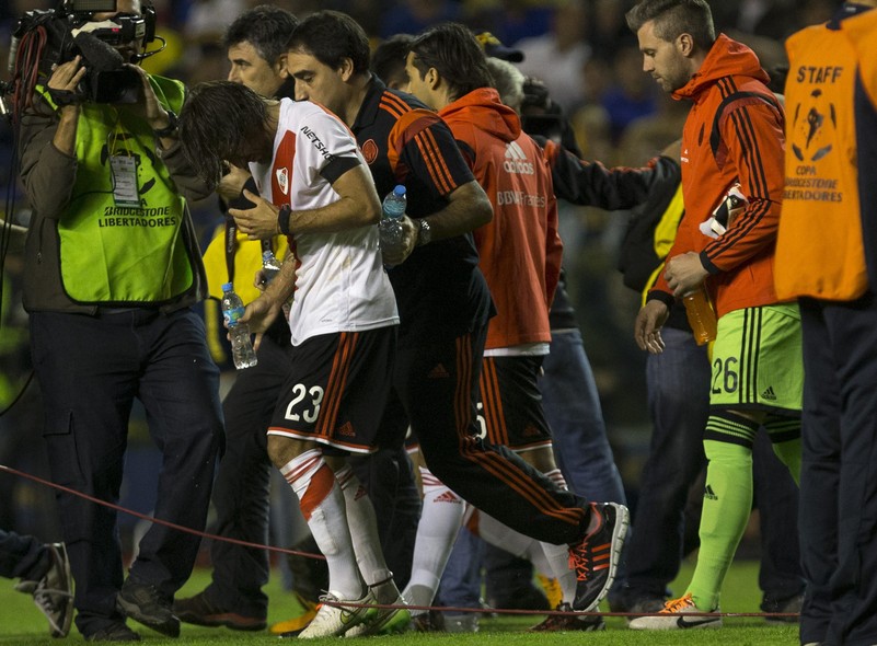 Na noite dessa quinta-feira, após o primeiro tempo, os jogadores do River retornavam ao gramado para a disputa da etapa complementar e foram agredidos por gás de pimenta no túnel inflável que dá acesso ao campo. Quatro jogadores do River, Leonardo Ponzio, Ramiro Funes Mori, Matías Kranevitter e Vangioni, sofreram queimaduras de primeiro grau e reação alérgica e precisaram de pronto atendimento médico. O duelo ficou paralisado por mais de uma hora até a Conmebol e a arbitragem decidirem suspender o jogo.