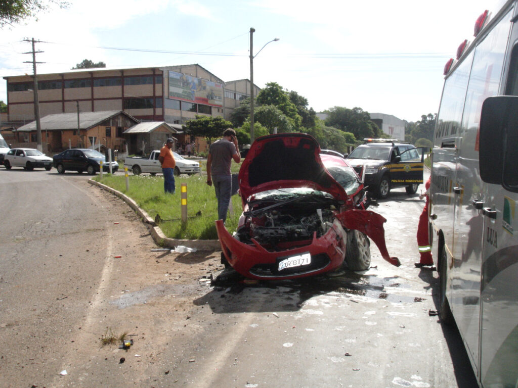 A condutora ao acessar a rodovia pelo trevo do Bairro Vera Cruz foi atingida pelo caminhão que arrastou o veículo por alguns metros arrancando placas de sinalização do canteiro no sentido a Embrapa Trigo.