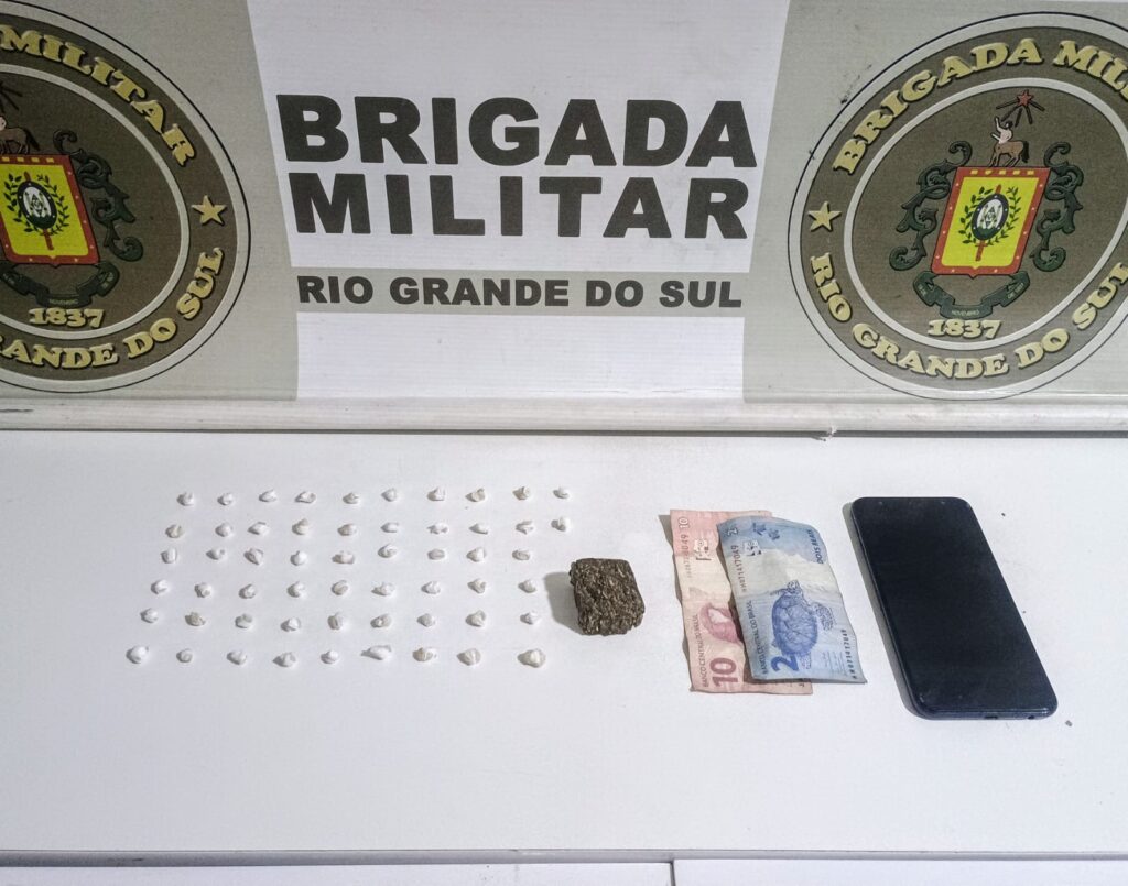 Entre os materiais apreendidos estão 56 pedras de crack, totalizando aproximadamente 8 gramas, uma porção de maconha com cerca de 19 gramas, dinheiro em espécie e um aparelho celular.