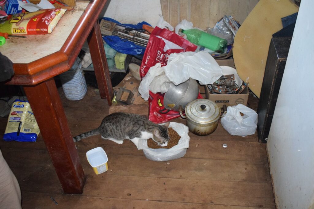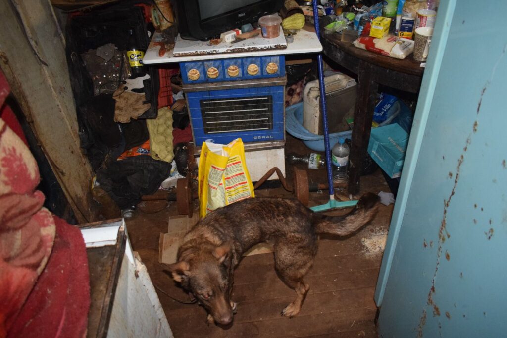 Ao chegarem ao local, os policiais militares, acompanhados por servidores da área da saúde e um médico veterinário, encontraram uma residência em condições extremamente precárias de higiene. No imóvel, vivia um homem com transtornos mentais, em meio a um ambiente de grande degradação, com acúmulo de sujeira, forte odor e presença de dejetos, o que representava risco à saúde.