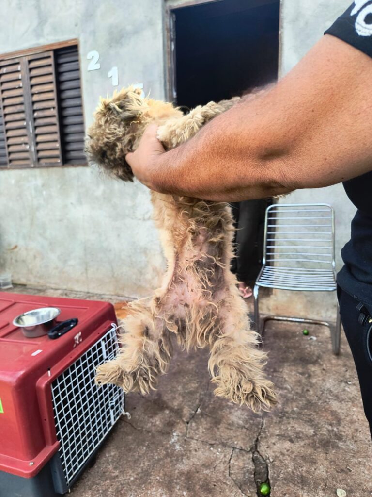 Os cães foram avaliados por uma médica veterinária, que confirmou a prática de maus-tratos. O animal de pequeno porte apresentava úlcera, cálculo dental em nível cinco e infestação por pulgas. Apesar do atendimento prestado, o cão de grande porte não resistiu e morreu.