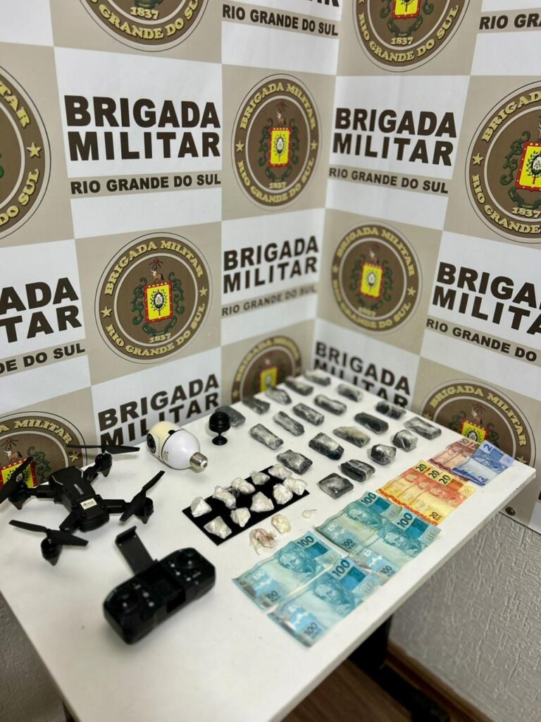 Em diligências realizadas na sequência, os policiais encontraram mais 20 porções de maconha somando 413 gramas, 10 porções de cocaína pesando 55 gramas, além de duas câmeras de monitoramento, um drone e R$ 482 em dinheiro.