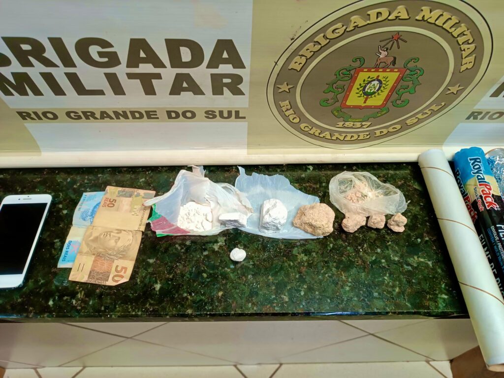 Durante a averiguação no local, os policiais realizaram buscas e localizaram porções de cocaína que totalizaram 65,6 gramas e porções de crack somando 48,7 gramas. Além dos entorpecentes, também foram apreendidos uma balança de precisão, papel filme utilizado para o fracionamento das substâncias, um aparelho celular e uma quantia em dinheiro.