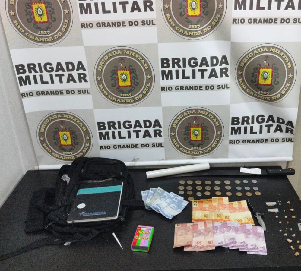 Na revista pessoal e na mochila, foram encontradas porções de crack, material utilizado para o fracionamento da droga, armas brancas e uma quantia em dinheiro.