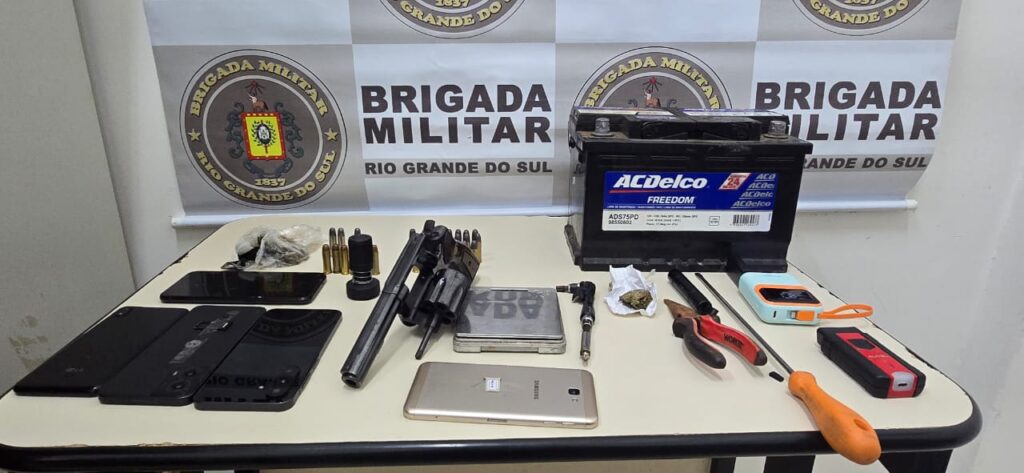 Durante a ação, os policiais localizaram uma caminhonete furtada que circulava com placas clonadas. No local, também foram apreendidos uma arma de fogo, munições, drogas e diversos equipamentos que, segundo a Brigada Militar, eram utilizados para a prática dos crimes.