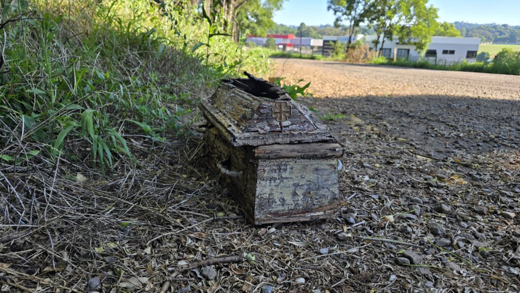 Na manhã desta quarta-feira (7), um caixão de pequeno porte, aparentemente destinado a uma criança, foi encontrado às margens da estrada, próximo à entrada do Parque de Rodeios da Roselândia, em Passo Fundo. O objeto estava na beira da pista, próximo a uma área de mata, a cerca de 100 metros do conhecido pórtico das botas.