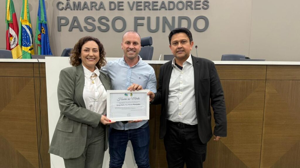 O Parlamento entregou um certificado de Honra ao Mérito, proposto pelo vereador Diego Milani (PL). Recebeu a distinção o Grupo Bella Vita Móveis Planejados, representado pelos empresários Emerson Elias Alencar e Rubia Mitla Orso. A homenagem destaca que o casal chegou a Passo Fundo em 2013, iniciando o trabalho da empresa no bairro São Cristóvão.