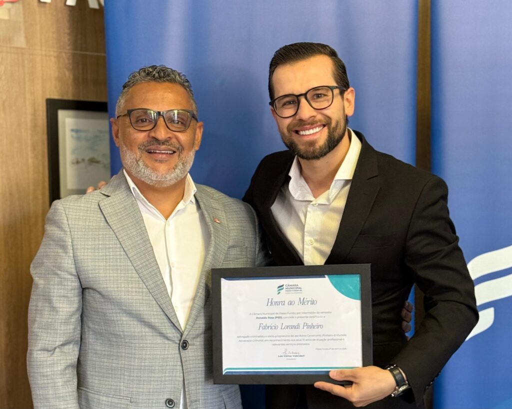 A Câmara de Vereadores de Passo Fundo concedeu a Honra ao Mérito ao advogado criminalista Fabrício Lorandi Pinheiro, em reconhecimento aos seus 10 anos de atuação na advocacia e à contribuição prestada ao meio jurídico.