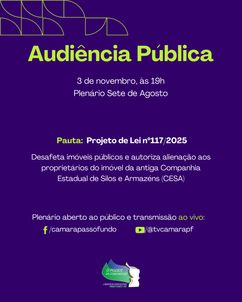 A Câmara Municipal de Passo Fundo realizará, na próxima segunda-feira (3 de novembro), uma Audiência Pública para discutir o Projeto de Lei nº 117/2025, de autoria do Poder Executivo. O texto propõe a desafetação de imóveis públicos e autorização para alienação das áreas aos proprietários do imóvel onde funcionava a antiga Companhia Estadual de Silos e Armazéns (CESA).