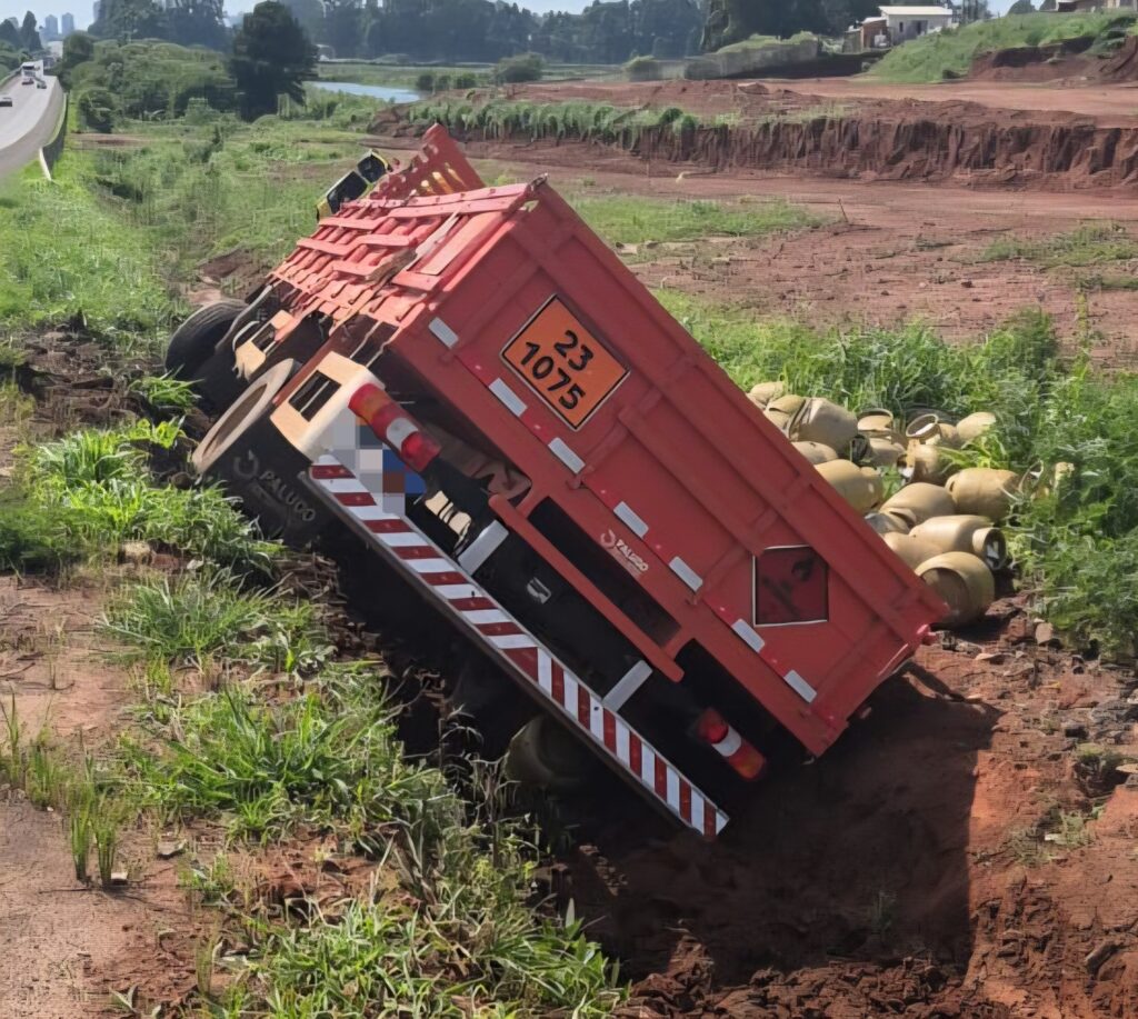 Caminhão carregado com botijões de gás sai da pista e cai em valeta na BR-285, em Passo Fundo O acidente ocorreu nas proximidades do bairro Zachia.