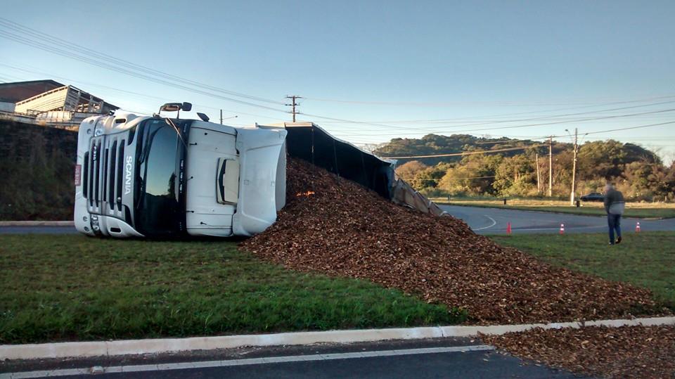 Por volta das 6h30 desta terça-feira, 22, um caminhão carregado com cerca de 12 toneladas de cavacos tombou no trevo de acesso à Perimetral Leste, em Passo Fundo.
