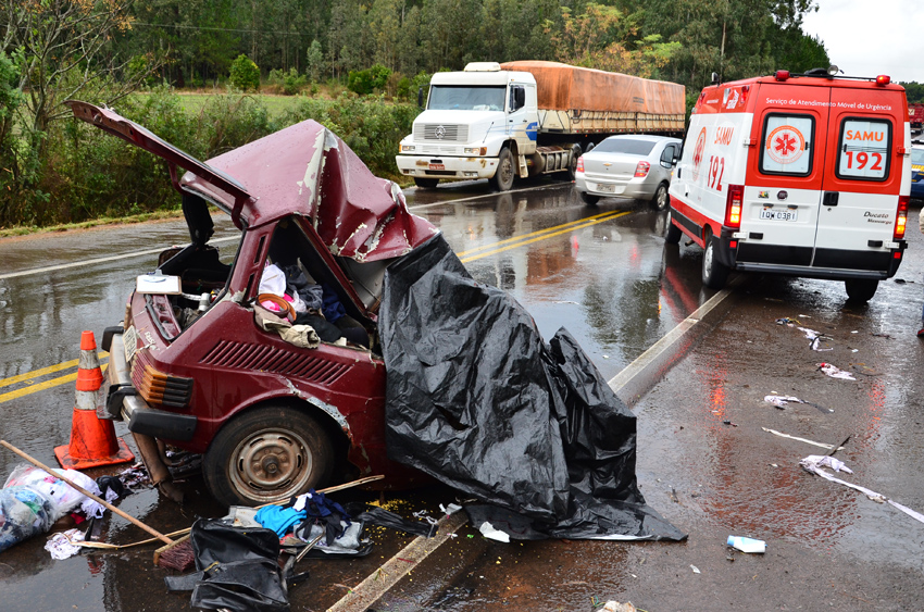 Por volta das 13h desta quinta-feira, um acidente de trânsito envolvendo um caminhão bitrem, placa ILB 1831, de Sarandi, e uma Brasília, placa IHX 7544, de Teutônia, deixou dois mortos no Km 220 da BR 386, próximo a ponte do rio Porongos, em Mormaço.