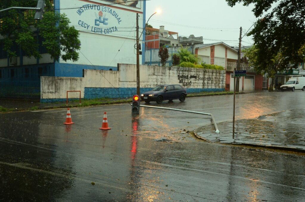 Com o choque, a sinaleira caiu, mas continuou funcionando. O trânsito está fluindo parcialmente no local e a Guarda de Trânsito está tomando as providências cabidas.