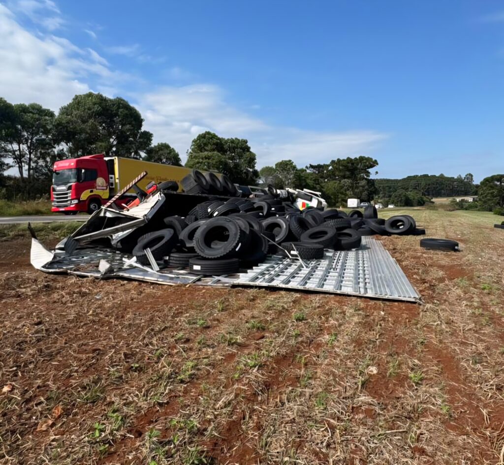 De acordo com informações preliminares, o veículo envolvido saiu da pista após o motorista perder o controle da direção e acabou tombando às margens da rodovia, em uma propriedade particular. O caminhão carregava pneus, que ficaram espalhados sobre a pista e também na área ao lado da rodovia.