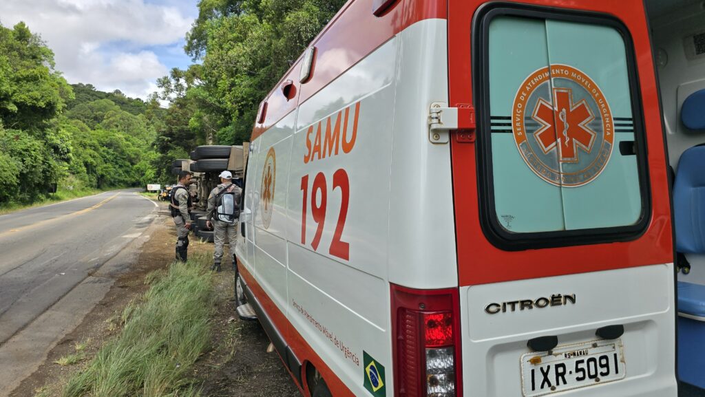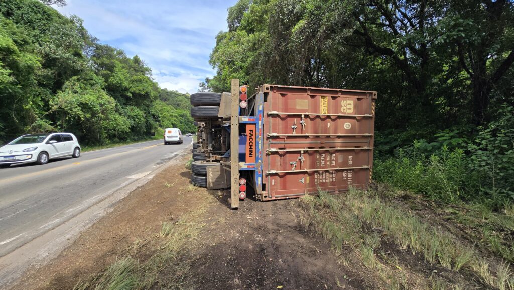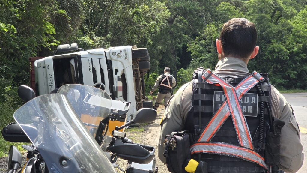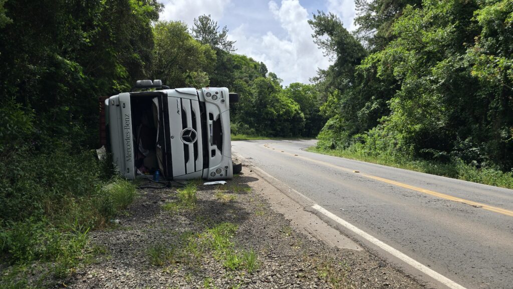 O Comando Rodoviário da Brigada Militar acompanha a ocorrência e sinaliza a via com cones. O fluxo de veículos segue normalmente nos dois sentidos, mas os motoristas precisam redobrar a atenção devido à curva fechada e à presença do caminhão no acostamento.