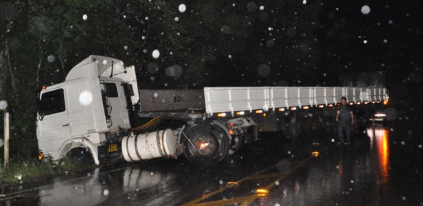 Uma carreta com placas do município de Carazinho , que seguia no sentido Passo Fundo/Marau, impediu o trânsito nas duas pistas da ERS-324, próximo à comunidade de São Luiz da Mortandade, por volta das 20 horas de quinta-feira, 25. O motorista perdeu o controle do veículo, que depois de aquaplanar na pista fez o chamado “L” e não conseguiu mais sair.