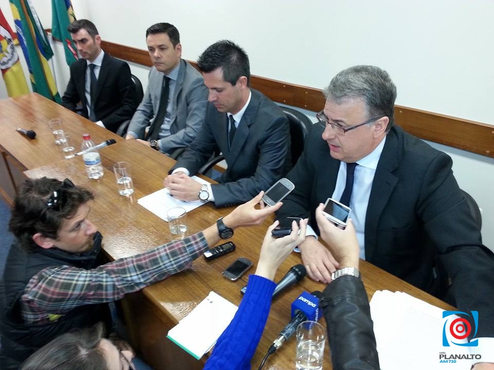 No final da manhã desta terça-feira, 23, os promotores de Justiça Paulo Cirne, Marcelo Pires, Álvaro Poglia e Júlio Balardin, e os delegados Mário Vieira e Mauro Vinícius Soares de Moraes concederam entrevista coletiva à imprensa para dar maiores informações sobre a prisão de Maurício Dal Agnol, ocorrida na noite de ontem, 22, em Passo Fundo.